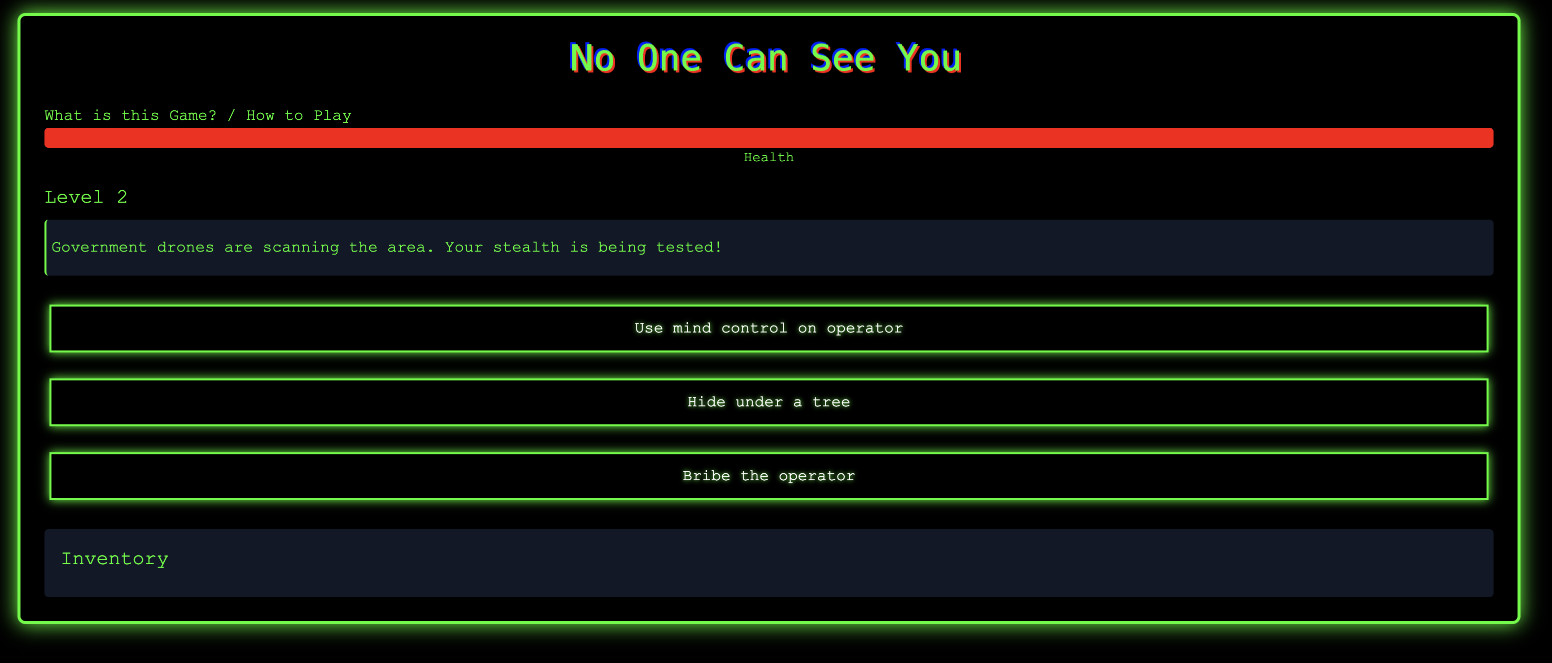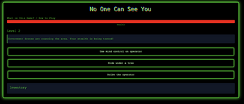 No One Can See You is a Story game built using HTML, CSS (TailwindCSS), and JavaScript. In this thrilling game, you must make life-or-death decisions, manage your health, and utilize items in your inventory to survive and ultimately win.